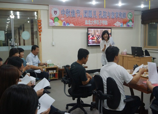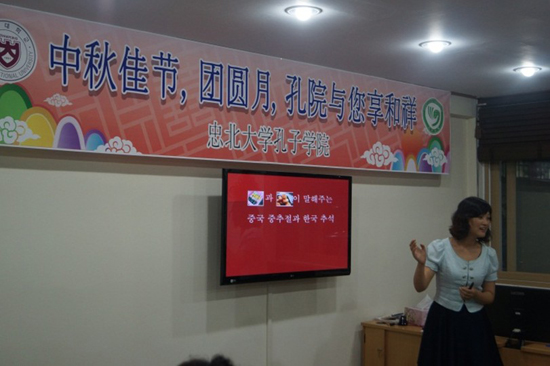 2013年9月11日至12日晚七点半,忠北大学孔子学院举行了两场以“中秋佳节,团圆月,孔院与您享和群”为主题的中秋节传统文化讲座,由孔子学院外派教师玄贞姬副教授主讲。忠北大学孔子学院崔亨龙院长以及各位汉语教师出席了本次讲座。孔子学院一百多名学员和忠北大学学生、教师参加了此次讲座。