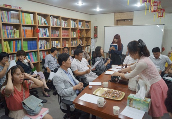 首先,玄老师从中国中秋节的月饼和韩国秋夕节的松饼为切入点展开了讲座。她从中秋节的起源、民间习俗、节日意义以及现代社会中的中秋节等几个方面展开了叙述。通过从不同角度与韩国秋夕节的对比,玄老师将中秋节这一中华传统节日的来历和相关习俗阐释的淋漓尽致,让学员们对中国中秋节有了深入的了解。玄老师风趣的语言、生动的演讲,博得学员阵阵掌声。期间,玄老师还向学员们发放了中国中秋节的象征——月饼,让学员们从视觉、触觉、味觉等全方位体验中国月饼。随后玄老师又向学员们介绍有关中秋之月的著名诗词,并引导学员们翻译成优美的韩国语诗句。