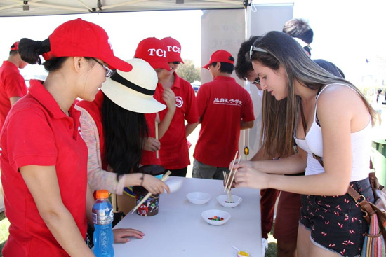 同时,孔子学院在专属展位精心布置了一个充满中国传统文化特色的“小舞台”。大红的中国结和各式传统窗花剪纸交相辉映,妆点在舞台和展台上;中国汉字文化和游戏吸引过往的观众驻足观看并积极参与;为外国友人取中文名并用毛笔写中文名书签的活动一如既往地受到男女老幼的欢迎;工作人员详细地为游客们解说孔子学院的各色文化课程和文化项目,派发宣传单。人们纷纷咨询自己感兴趣的中国语言与传统文化课程。