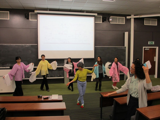 在实践环节中,李惠馨老师示范了水袖、扇子、马鞭等昆剧基本道具的使用。她介绍道,昆剧袖子前端的一截白绸即称“水袖”,水袖柔美飘逸,利用它可以做出千变万化的身段动作,来展示昆剧中各人物的不同情感。在座不同年龄来自不同国家的师生也体验了一把昆剧中的折袖动作。之后,李老师以短句“好天气也”为例,带领大家学习了昆曲的基本声乐技巧,其曲调行腔优美、缠绵婉转、柔漫悠扬。最后,她现场演绎了昆剧名曲《寻梦》,绣花鞋、兰花指、大长袍,综合了这些极具特色的元素,再次掀起一轮艺术震撼。近两个小时的讲座让听众感受了中国明清时期“百戏之祖”昆曲曲艺的韵味,余音绕梁。