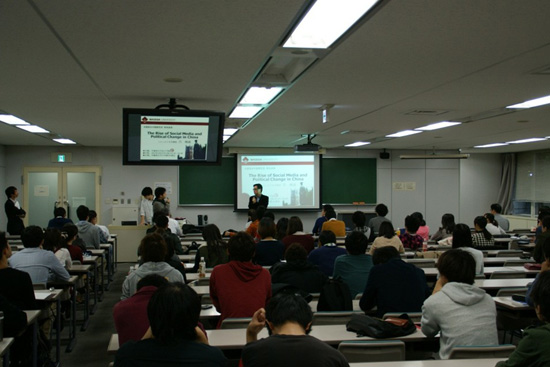 10月23日下午,早稻田大学孔子学院在早稻田大学22号馆举办了“中国社交网络与政治变化”专场演讲会。邀请来自美国哥伦比亚大学的吕晓波教授,面向200余名早稻田大学学生和校外听众,通过翻译用中文做了精彩的报告。