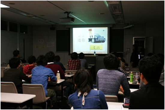 本次演讲的主题是“汉语中的外来词”。段老师首先将汉语中的外来语从“音译”、“意译”、 “品牌名”、“国名”、“人名”、“作品名” 以及“从日语中引进”这几个角度进行了分类。在讲解各种类型的基本变化规律的基础上,段老师将各类汉语外来词汇展现在屏幕上,以猜谜的形式充分调动学生们的兴趣。学生们争相回答,教室的气氛也相当活跃;当遇到某些比较难的词汇时,学生们各个苦思冥想,段老师给出一些提示后,有些同学瞬间恍然大悟,而有些同学仍然不知所以,直到最后给出答案,大家才直呼:“原来如此!”