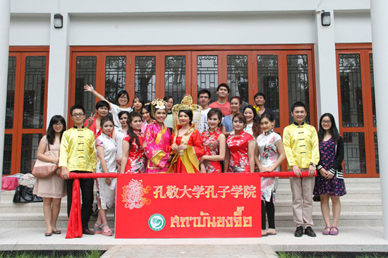 孔子学院首次报名花灯游行,受到水灯节主办方的高度重视,是当日参加游行的第一个学院。下午两点整,花灯游行正式开始,游行队伍从金色大厅大门口开始,一路走到校园主干道。孔子学院的25名师生身着汉、唐、清三朝中国传统民族服饰,举止大方,面带微笑,队伍整齐;队伍最前方为醒目的印有中、泰文“孔子学院”字样的红色牌匾;其次是泰国国王、王后的大幅照片,反映了孔子学院在传播中国传统文化的同时,也尊重当地的风俗习惯;孔子学院的“水灯”是以长长的芭蕉叶折出一瓣瓣莲花盛开的形状相叠加,四角挂上印富有中国传统特色的小红灯笼,中央插上代表希望之光的蜡烛,寓意丰富、制作精致。