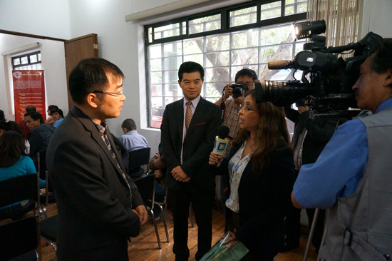 新闻发布会前蔡天新接受墨西哥22频道记者采访