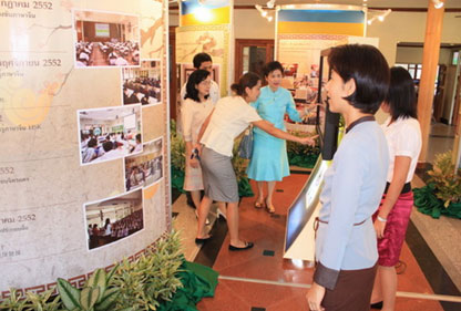 在踏入吉拉达学校大门后,夺目而来的是本次活动的重头戏之一 ——吉拉达孔子课堂成果图片展。一幅幅高约两米的精美展图上,累积了在诗琳通公主关怀下所取得的汉语教学成果,皇室学校对汉语的重视,更体现出了中泰两国的友好交往。各国嘉宾惊叹地欣赏着孔子课堂的汉语成果:中泰共同庆祝中国传统节日、泰国学生体验中国语言文化营、中国文艺竞赛、中文知识比赛以及在泰中文图书展的热闹场面等。