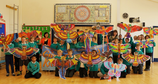 风筝节包括19场活动,超过1000人参加了活动。图为在班戈Cae Top学校的活动,70多学生分两组参加了画风筝的活动。图为其中一组学生展示画好的风筝。