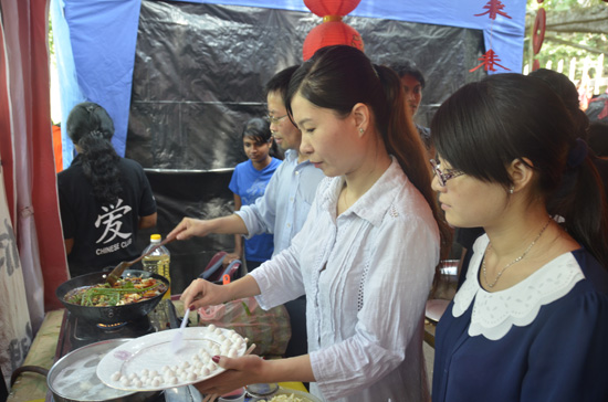 凯拉尼亚大学孔子学院现场制作的中国特色食品包括重庆火锅、重庆汤圆及北方面条。侯万春院长现场亲自煎炒底料、熬制重庆火锅;孔院汉语教师及志愿者教师们则忙着宰鸡破鱼弄虾切菜,赶制汤圆与面条,动作娴熟,一气呵成。