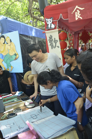与此同时,孔子学院志愿者教师马屹峰还在在孔院灶台前搭起了展示中国书法的桌子,并教授感兴趣的师生写毛笔字。参观的师生们兴致勃勃,驻足欣赏。11点半,负责接待食客、介绍食品、教食品名称汉语的老师们纷纷盛菜端盘,热情地为凯大师生服务。一时间,孔院的“食品摊”前人山人海,火锅鸡、鱼虾、甜汤圆、春卷、面条……各色小吃琳琅满目,个个都供不应求。凯大孔院此次展出的重庆火锅最受青睐,红红火火的火锅汤翻滚着,散发的香味久久弥漫在凯大校园里,很多尝过火锅的师生都试着用刚学来的汉语说“火锅好吃”。还有特意赶来吃火锅的食客们,在校园内排起了长龙,忙坏了孔院工作人员,这一场景让其他国家食品展台的工作人员们羡慕惊叹不已。