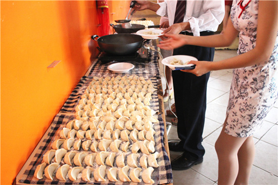 介绍结束后,紧接着开始开幕式节目表演。首先由志愿者罗丹和宋家坡演唱歌曲《龙文》,美妙的旋律,优美的歌声赢得了现场观众阵阵掌声。曲罢,孔院的女教师们穿着旗袍,踩着高跟鞋,走上舞台,合着音乐节拍,走起旗袍秀,带给了观众一种全新的视觉体验。旗袍秀结束,武术教师孟召峰一套行云流水般的拳脚功夫震撼了全场。紧接着,志愿者教师李梦带着她太极班的学生们,在舞台上摆开整容,从容地打起太极。看着自己的同胞们熟练地打着太极拳,台下观众掌声不歇、喝彩不止。开幕式表演结束,我院全体工作人员将事先做好的饺子端出来给观众们品尝。