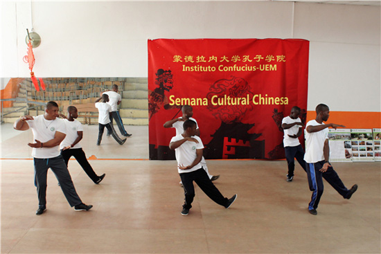莫桑比克当地时间2013年11月12日至15日,我院于莫桑比克师范大学举行了蒙德拉内大学孔子学院第二届中国文化周。主要内容为:11月12日,第二届中国文化周开幕式;11月13日,中国武术;11月14日,中国功夫之太极拳;11月15日上午,中国传统服饰;11月15日下午,中国美食之饺子及文化周闭幕式。