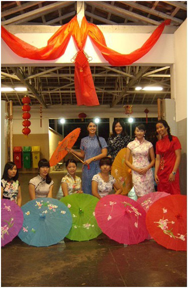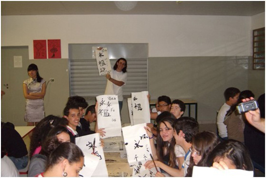 十一月是巴西的初夏,在巴西圣保罗大学孔子学院和Araraquara当地教育局的共同支持下,两名孔子学院汉语教师志愿者王小诗(任教于Araraquara语言中心)和慕涛(任教于圣保罗州立大学Araraquara校区)在Araraquara的语言中心,针对当地高中生举办了一场带有浓郁中国特色的“中国元素嘉年华”。圣保罗州立大学孔子学院精心 为这场活动准备了各种具有传统特色的道具:灯笼,中国结,文房四宝,旗袍,有声挂图,影音光碟和茶具,在语言中心的工作人员协助下,志愿者教师和学生们一起用这些道具将整个活动会场装饰得极具中国风情。