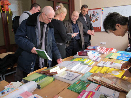科什金副校长向“伊丽莎白”翻译学校校长介绍图书