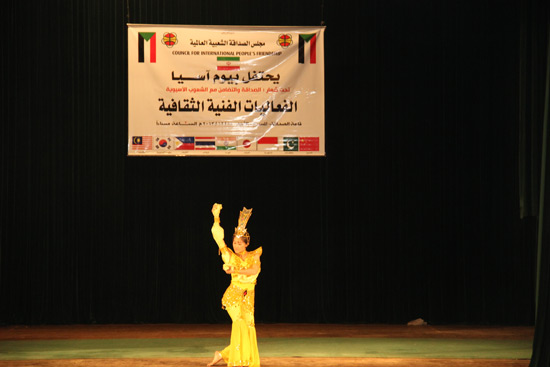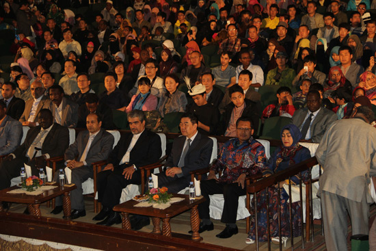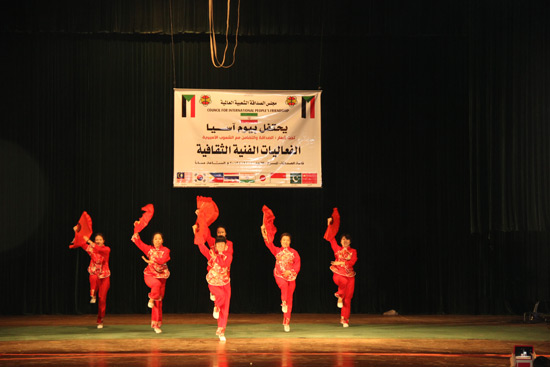 晚8点,中苏友谊大厅汇合亚洲各国文化,文艺演出正式开始,苏丹文化部部长哈森致辞,现场观众600余人。中国第三个出场国家,孔子学院共推扇子舞和敦煌舞两个节目,来自喀大孔院的教师一亮相,就赢得了满堂喝彩,将演出推向了高潮。