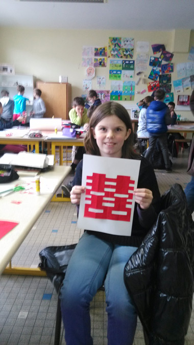 由于很多学生是第一次接触汉语,第一次和中国老师面对面,为了拉近与学生之间的距离,矫雅楠老师首先与每一位学生用汉语问好并相互介绍。随后,老师通过幻灯片向学生们形象介绍了中国剪纸的发展变化、中国民俗与当代中国人生活的密切关系,展示了“孔子”、“十二生肖”等中国传统剪纸的代表图案。学生们对神奇的中国剪纸非常感兴趣,并用抢答的方式争相回答老师提出的关于十二生肖和“福”字“喜”字寓意的问题,现场气氛十分热烈。在动手环节,学生们亲自动手体验喜字和团花的制作过程,看着自己的剪纸作品,孩子们的兴奋与喜悦溢于言表。在场的法国老师们也纷纷表示对中国文化课程的兴趣,并希望将来能有机会到孔院学习。
