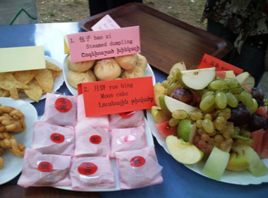 孔子学院与当地中国龙餐厅携手为来宾们准备了中国月饼、饺子、包子、炒面、油炸馒头、麻花、焦叶等中国美食以及各种水果。活动邀请了驻亚使馆代表潘勇、亚中友协会长恒瑞•格里高阳及夫人、亚美尼亚文化协会主席叶夫格里娜女士、亚美尼亚布留索夫国立语言大学副校长巴拉扬教授和阿瓦克扬教授以及亚大、中、小学代表共200多人参加了美食节开幕式。中国留学生演唱了苏轼的《水调歌头》及《万水千山总是情》,孔子学院学生演唱了《送别》以及“十五的月亮”、“敖包相会”等中国传统歌曲并朗诵了中国古诗词。