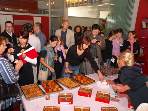 在欢乐的中国传统民乐和斯洛文尼亚民乐当中,与会嘉宾饶有兴致地品尝了月饼、春卷、黄酒和斯中两国的红葡萄酒。