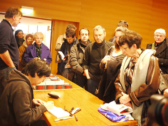 期间,普瓦提埃大学孔子学院理事长Alain Mignot和图书馆馆长出席见面会,聂崇瑞先生一一回答了现场粉丝的问题,同时对其个人生平、创作思路做了详细介绍。聂老师非常幽默,现场交流的气氛十分热烈。最后,聂崇瑞先生将《包拯传奇 》连环漫画签字版本赠送给孔子学院。