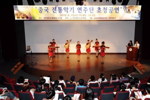 9月15日,“中国传统民乐演奏会”在仁川大学礼堂隆重举行。七位青年演奏家们运用二胡、琵琶、扬琴、古筝、笛子、萧、葫芦丝等中国传统乐器,为观众们演绎了中国传统民乐中的经典之作。同时,她们将传统乐器与现代音乐元素相融合,向观众们展示了中国“新民乐”的魅力。整场演奏会极具感染力,令在场观众如痴如醉,礼堂里多次爆发出热情的欢呼和掌声。