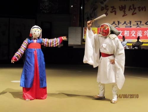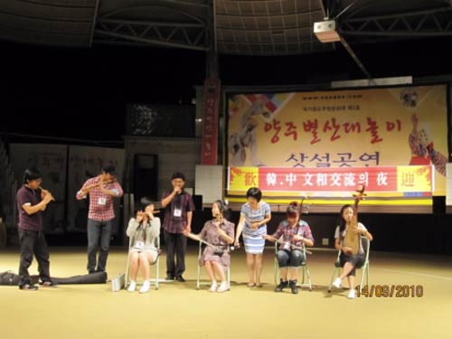9月14日,孔子学院的师生、大连民族乐团成员与韩国杨州别山台民俗协会共同举行了别开生面的文化交流活动。韩国杨州别山台民俗协会表演的假面舞剧及国乐被指定为韩国“无形文化财2号”,是韩国重要的非物质文化遗产。活动中,民俗协会为大家表演了精彩的假面舞剧,而大连民族乐团则为大家献上了《喜洋洋》、《十面埋伏》等中国经典民乐。在活动最后,中韩青年演奏家们分别用具有中韩特色的传统乐器共同演奏了《大长今》,将“中韩文化交流之夜”推向高潮。