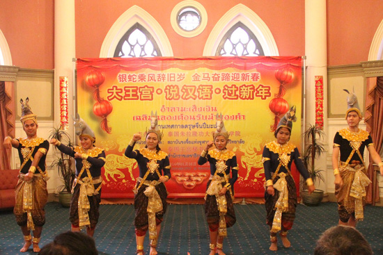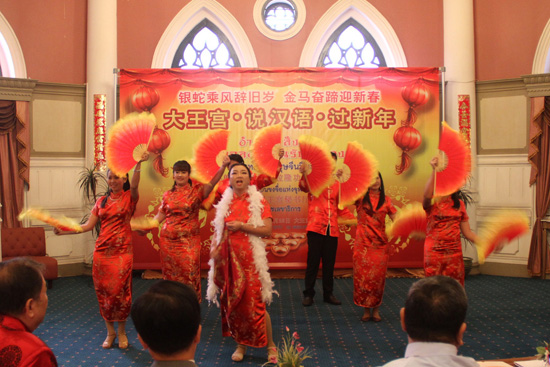 联欢活动中,王宫官员们表演了汉语讲解春节习俗、朗诵中国诗歌《登鹳雀楼》、泰国传统马头舞、汉语小品《过春节》和集体扇子舞;朱大孔子学院全体教师合唱泰语歌《大象歌》和《恭喜恭喜》、张玉娇老师表演了独唱《映山红》。整场联欢精彩不断,高潮迭起。宁赋魁大使和各位嘉宾兴致勃勃地观看了演出。演出结束后,宁大使与格利秘书长一起为参加活动的全体人员派发了红包,送去了节日的祝福。宁大使最后表示,明年还会来参加王宫的春节庆祝活动,到时希望看到各位学员们取得更大的进步。