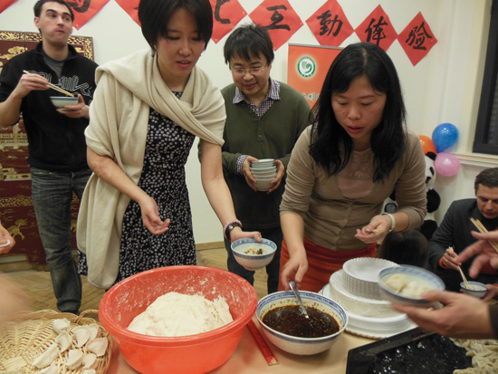 装修一新的孔子学院大教室容纳了来自比中协会会员、孔院学生、欧盟第四中学教学点学生等60余人,他们观看了有关中国狮子舞的电影短片,欣赏了欧盟学校中学生表演的中国秧歌舞、一起聚精会神地目睹了中国画家现场作中国牡丹花,并当场为来宾用宣纸书写中文姓名作为礼品。随后在十分融洽的气氛中一起参与了中国传统春节习俗包饺子活动。整场活动历时3个小时,所有参与者乘兴而来,欢声笑语,满意而归,即体验了中国文化也了解了孔子学院的办学宗旨和发展前景。