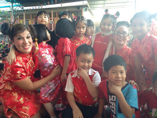 身着中国旗袍的老师和学生们