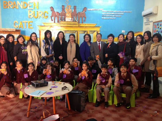(国际台记者秦胜瑞 课堂公派教师管俊康):当地时间2014年1月27日,在中国驻巴基斯坦大使夫人包吉氢以及文化参赞张英保的带领下,由使馆工作人员组成的春节文化宣讲团,与国际台巴基斯坦广播孔子课堂的师生,在课堂合作方根基千禧学校瓦希德校区共同提前庆祝了马年新春。