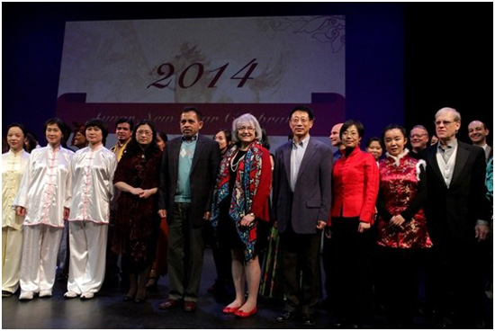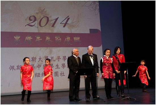 除旧迎新,万马奔腾,瑞雪纷纷之中,农历马年新春翩然而至。2014年2月2日下午,佩斯大学孔子学院在曼哈顿下城米高.西蒙(Michael Shimmer)艺术中心举办盛大活动欢庆农历新年的到来,700多位来宾参与了活动。孔院已是连续第4年举办新春庆典,活动不仅成为中国文化展示的亮点,也已成为纽约亚裔乃至各族裔迎接新年的大联欢。出席本次晚会的嘉宾有斯里兰卡大使Palitha T. B. Kohona博士、联合国中文组何勇博士等,佩斯大学戴森文理学院院长赫曼博士等校领导、孔子学院院长牛卫华博士、中方院长朱敏博士等也参加了活动。