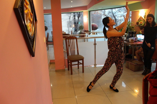 首先是中文歌展示。这里的中学生们通过中国歌曲的学习,不仅学习了汉语,而且也爱上了中国的音乐。学生们演唱了《对面的女孩看过来》、《月亮代表我的心》和《宝贝》,由郭老师亲自用吉他伴奏。学生们还跳起自编自演的舞蹈,欢快的节奏。别样的舞蹈,师生共同参与,让学生在歌中体验中文的语言魅力,收获学习的快乐。