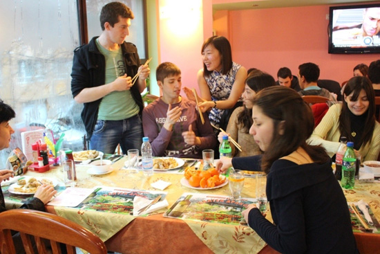 第五个活动是体验中国美食和学习使用筷子。郭老师为大家讲解中国人过春节时的传统习俗——吃饺子,放鞭炮,合家团圆,让大家感受中国春节的喜庆欢乐。吃中国食物一定要学使用筷子。图为郭老师正在教学生如何使用筷子夹饺子,尽管过程艰难,但可爱的同学们都勇于尝试。