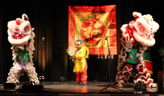 晚上7点,文艺演出正式开始。首先是来自波特兰州立大学国际管理研究生院的学生们给大家拜年的视频播放,《说唱中国地图》和《说唱美国地图》等节奏明快、喜感十足的表演赢得观众的阵阵掌声。接着锣鼓喧天的舞狮表演在大家的欢呼声中跃上舞台,憨态可掬的大头和尚和神态俏皮的两头狮子幽默诙谐的表演引得观众们笑声此起彼伏,两头狮子时而对着观众眨眼亲昵,时而摇摆尾巴,时而相互争斗,现场气氛一下子热闹欢腾起来。接下来是一段2014年央视春晚的舞蹈节目《万马奔腾》视频,奔腾的骏马、磅礴的气势和精彩的表演将马年的祥瑞之气带到了现场。