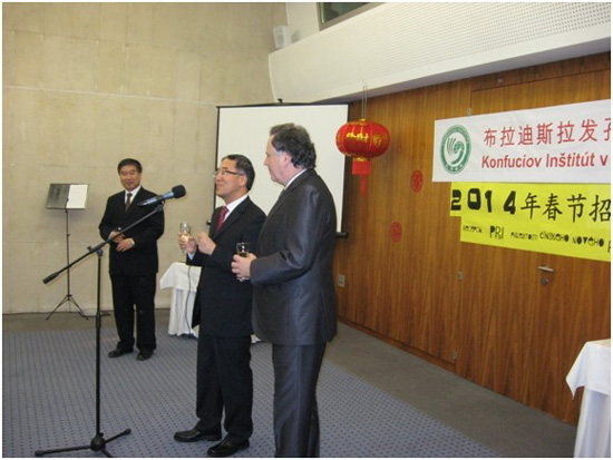 2014年1月29日下午,在斯洛伐克“最温暖”的冬季里,布拉迪斯拉发孔子学院新春招待会在斯洛伐克国宾馆---Borik宾馆隆重举行,与当地政商各界友好人士,华人华侨代表及孔子学院的学生及其家长们欢聚一堂,欢度中国的马年春节。中国驻华大使潘伟芳,斯洛伐克国务院副总理Mr.LubomirVazny斯洛伐克技术大学校长Mr.Redhammer,等出席了招待会。