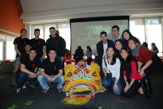 学生与舞狮表演者合影