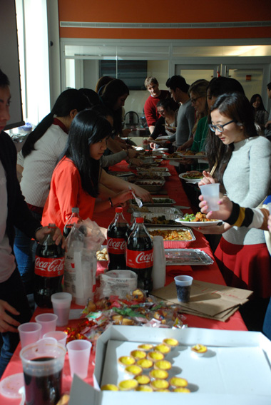 2月7日,纽约州立大学视光学院孔子学院在学院三楼大厅举办了中国春节联欢会活动。这次活动吸引了两百多位视光学院的学生和教职员工参与。倒挂的福字,喜庆的春联,大红的灯笼,大厅里到处洋溢着欢度新春的气氛。春节习俗的视频讲解,普及了中国新春文化;伴着锣鼓阵阵的精彩舞狮,赢得了满堂喝彩;精心准备的春节美食,让人赞不绝口;压岁红包的抽奖,更是带给大家一年的好运,将联欢会推向了高潮。许多美国学生表示每年的这个时候都跟中国人一样期盼着中国春节的到来。我们孔院也希望借助这样的活动能使中国的春节文化在美国师生中更加深入人心。