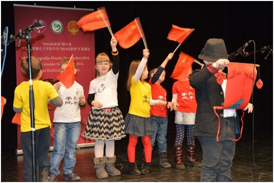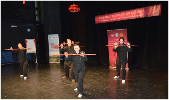 来宾们一起观看了孔子学院的学员们为大家准备的汇报演出,现场气氛十分喜庆热烈。晚会节目包括中国歌曲,中国舞蹈,诗歌朗诵以及中国功夫等,博得阵阵喝彩。来自贝尔格莱德孔子学院汉语点的第十三中学、数学中学、第八中学和语言中学的中学生们,贝尔格莱德大学语言学院的大学生们,还有孔子学院的其他学员们一起为大家演唱了《龙的传人》等中国歌曲,并表演了中国舞蹈。孔子学院学龄前汉语班的小朋友们,他们刚刚学了五个月的汉语,有的才四岁,也上台展示自己的汉语,他们那稚嫩的声音和可爱的表演赢得了观众的阵阵掌声和欢笑。贝尔格莱德孔子学院的长期合作伙伴—塞尔维亚太极拳协会和武术俱乐部也为大家带来了精彩的太极和剑术表演,向观众展示了原汁原味的中国功夫。