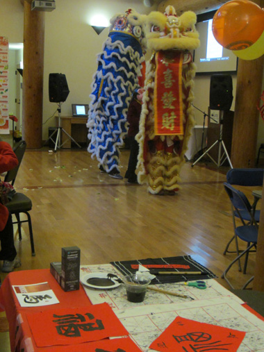 大年初二与当地华人协会恭贺新年的盛会高潮不断。在这最为盛大的节日中,我们与当地的社区华裔都有着共同的心愿,力图还原最为传统的春节方式,让年幼、年轻的华人以及热爱中华文化的美国朋友真实体验我们的新春佳节,品尝地道的“年味”。中国结、春联把活动场地装点一新, 入口展台摆放了春节家宴的必备佳肴:年年有“鱼”、大吉大利的柑橘、象征人丁兴旺的“茨菇”、 聪明勤恳平安的芹菜、葱及苹果、还有“顺风”、“口条”、年糕都传递着最为直观的年俗气息。热闹的狮舞让男女老少激动不已,“捞鱼生”吉利口彩,其乐融融,场内古筝表演,琴瑟阵阵,欢歌笑语,每家携带的菜肴各具地方特色,“Potluck Party”这一西方形式让欢聚一堂的人们在他乡异地欢庆新春的到来。孔院布置的春联书法展台极具人气,大家纷纷过来求字,纳福讨吉。值得一提的是,在场的华人协会创始人、孔子学院的理事会成员Ada Lee博士,致辞时提及当天正逢生日,我们迅速书写寿联,由两位院长当场赠与:“福如东海,寿比南山”,耄耋老人在众人的“生日歌”中收下这份祝福,笑谈自己年方“Thirty Eight”的回应把场内的气氛推向了高潮。接近尾声,寿星独坐场内当中,开始派发红包,孩子们纷纷排队上前,磕头拜年 “压岁” 祈福, 大家共同营造着记忆中的传统年味,让人感到无比的熟悉、亲切, 全场沉浸在一片热闹祥和的氛围中。
