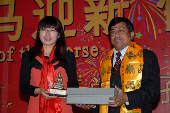 按照尼泊尔的习俗,中国驻尼使馆文化处随员李明明女士为联欢会点灯,拉开了联欢会的序幕,中尼嘉宾喜迎中国新春。