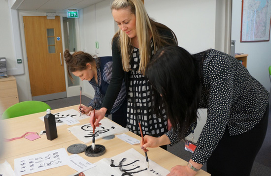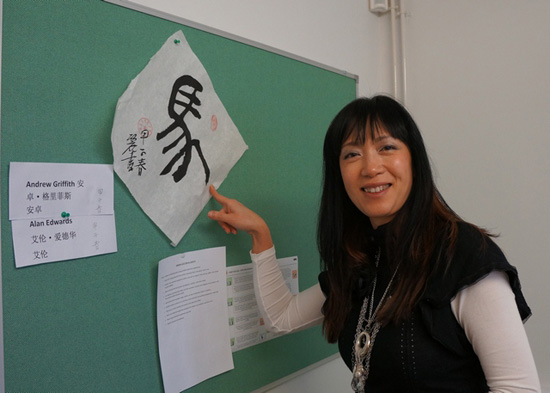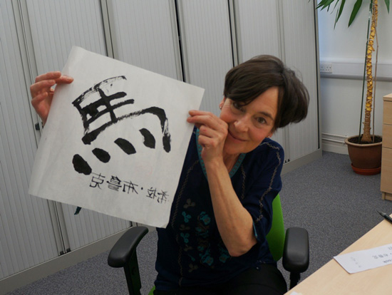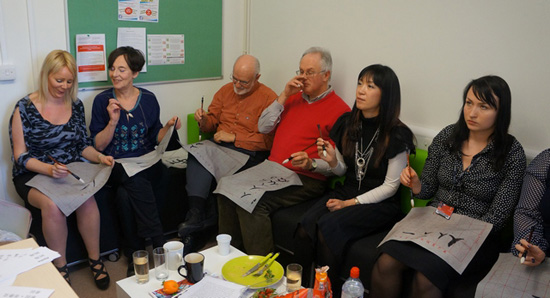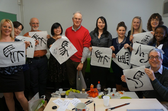 2014年2月5日,应班戈大学国际发展部的邀请,孔子学院在国际部定期举行的午餐讲演会(lunch talk)上组织了“马年听马,马年写马”活动。活动开始前,英方执行院长David先介绍了孔子学院近期的活动,希望大家多参与和支持孔子学院的各项活动。随后英方院长石巍博士介绍并表演了二胡,因为是马年,他选择了赛马片段为大家演奏。老师们对这二根弦的中国民乐产生的兴趣,纷纷前来小试。之后由中方院长张丽英教授主持“写马”的书法活动。她事先为老师们准备了各种书法体的“马”字,并为每位来参加活动的老师起了一个中文的名字,告诉大家书法的时间落款今年应当是“甲午”,并介绍了什么叫“斗方”、闲章、文房四宝等。搞哲学的Keith Beasley老师得到了“吉思”的名字,张教授向他解释是“luck thinking”的意思,他感觉这个名字跟他的专业有关系,十分的喜欢。老师们非常有兴趣地在速干的水写纸上学写中国书法,当然要在这么短的时间完成一件作品还真是件难事,于是张教授迅速给每位写了一个“马”字,只让大家以自己的中文名落款,真正体验一下在宣纸上,用墨写字的感觉。真正正确的写上自己的名字也不是一件容易的事,Sheila Brook老师把自己的名字写在了背面,但她还是非常兴奋的展示自己的作品。讲演会结束的时间到了,大家还久久不愿散去,并提议孔子学院专门为老师组织书法课。
