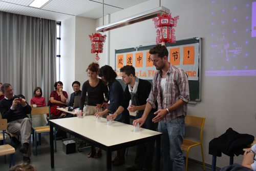 中国留学生韦佩光担任本次联欢会的主持人,她流利的法语和幽默风趣的主持风格促成了台上演员和台下观众的热烈互动。由法国学生朗诵的诗歌《嫦娥》,演唱的歌曲《北京欢迎你》和《小薇》赢得了观众阵阵热烈的掌声和欢笑声。有的法国学生穿着带有中国元素的服饰来参加联欢会,中法服饰的完美结合构成了本次联欢会的又一道亮丽的风景线。四名法国学生带来的《塑料杯打击乐表演唱》和中国文化知识竞猜把联欢会推向了高潮,观众们一边品尝月饼,一边欣赏自编自演的节目。会场外的中法师生们争先恐后地玩着画鼻子,夹玻璃球等有奖小游戏,还有太极拳表演,引得观者们竞相模仿,场内场外气氛十分热烈。