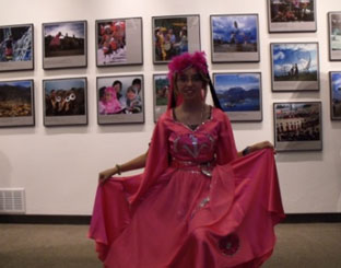 中秋节活动现场还展出了中国各少数民族的大幅彩色照片100余幅,和10几套中国少数民族服装。照片和服装均由孔子学院的中方合作院校----中南民族大学提供。一幅幅精美的照片令美国教师和学生赞不绝口,深感中国各民族文化是如此地丰富多彩。一套套多彩的民族服装也同样吸引了众多来宾的目光,很多学生纷纷穿上民族服装,过了一把中国瘾。