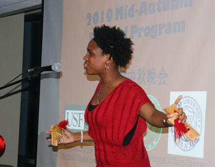 晚会由孔子学院院长史昆主持,南佛大副校长Linda Whiteford 和中国海洋大学副校长李华军致欢迎词。中秋晚会的前半小时,大家品尝了月饼和饺子,同时观看了介绍中秋传统和孔子学院的幻灯,以及魏柯(Victor Florez)参加汉语桥比赛获得一等奖的视频片断。晚会演出由雷明顿(Remington Tramel)和王志新共同主持,特别节目有:陆梦生(Marsha Louis)的快板书“吹牛”;车洁(Jessica Church)的绕口令“九杯酒”;中国学生学者联谊会前任和现任主席(孟菲、王志新)与陆梦生姐妹合唱的“月亮代表我的心”;谢博德教授(Eric Shepherd)的山东快书“学文化”;以及邹江华弹奏的琵琶乐曲等。