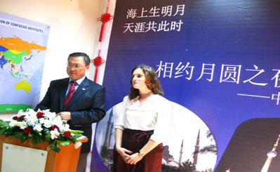 当地时间9月22日,土耳其海峡大学孔子学院张灯结彩,悠扬的乐曲增添了节日的气氛。为庆祝中秋佳节,孔子学院中秋招待会暨夏令营图片展于下午6:00正式开始。来自中国驻伊斯坦布尔总领馆、美国驻伊斯坦布尔总领馆、驻伊中资公司、海峡大学和其它高校的师生以及对中国文化满怀兴趣的各方朋友100余人,齐聚孔院,共庆佳节。