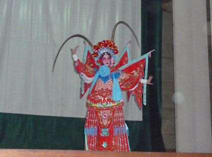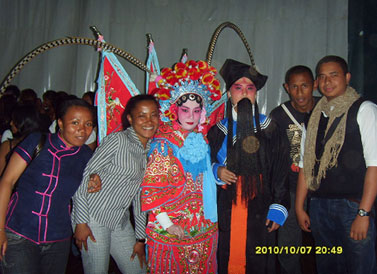 10月7日,塔那那利佛大学校园里出现了一队奇装异服的中国人,吸引了沿路好奇的马国师生随行。这些正是化妆穿戴完毕的来自江西师范大学学生京剧团的演员们,有手持双剑的虞姬,有精心绘制脸谱的楚霸王,有华服锦绣的男旦杨贵妃,有帅气艳丽的刀马旦樊梨花..