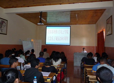 随后,孔子学院汉语教师朱习文博士作了题为“孔子及其思想”的专题讲座。讲座介绍了孔子的生平,孔子对中国及世界的影响,还结合《论语》中言简意赅、富于哲理性和启发性的经典语句阐发了孔子思想的精髓。最后,孔子学院师生共同观看了中国电影《孔子》。