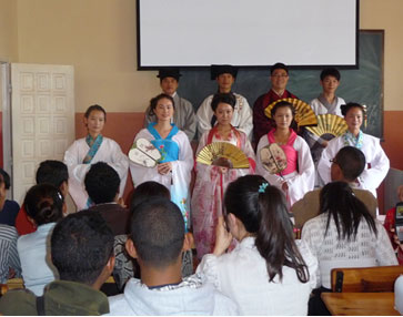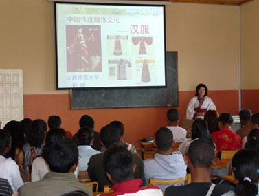 活动中,来自江西师范大学文化研究院的杨颖教授用翔实丰富、图文并茂的资料,就华夏民族的服饰 ——汉服的形成发展史作了讲解,精彩细致的讲述不时获得了听众们热烈的掌声,在讲座最后,杨颖教授还就当前国学热、传统文化热大背景下汉服复兴的前景和孔子学院师生作了探讨。