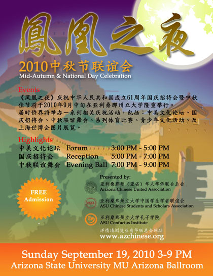 [!--allfrom--]| 亚利桑那州立大学孔子学院举办“2010中秋暨国庆庆祝晚会” | |
