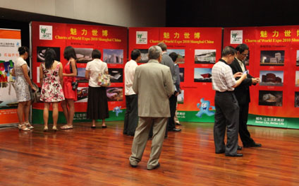 参加庆祝晚会的各界人士在世博会图片展区留连驻足