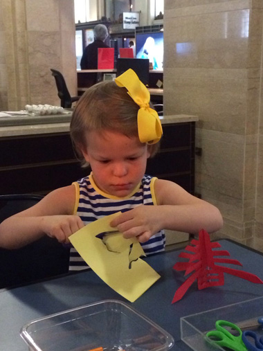 此次的“快乐家庭日”活动内容非常丰富,包括舞狮表演、打乒乓球、中国剪纸、模拟邮件分拣、集邮、邮票设计、与儿童读物《苦力》作者共读故事时间、现代铁路模拟展示等,博物馆的一楼和二楼展厅布满各式展台。其中最吸引观众的活动之一便是美国乔治梅森大学孔子学院带来的中国传统文化剪纸。博物馆二楼正中两张布置精美的展台上摆放着各种颜色、各种图案的剪纸样品,红的、黄的、绿的,蝴蝶、金鱼、老虎,既有中国传统色彩,又有中国传统图案,吸引了一个个家庭,特别是那些活泼可爱的孩子们的注意。孩子们纷纷围拢过来,争相学起剪纸,大一点的孩子独立剪出一幅剪纸作品,喜悦地珍藏在塑料袋里,小一点的孩子甚至拿不稳剪刀,在孔院教师的帮助下剪出一个个小小的蝴蝶,也骄傲地向父母展示。前来欣赏和学习剪纸的观众们川流不息,来自乔治梅森孔院的5位教师和志愿者身穿鲜艳的民族传统服饰,从上午11点一直忙到下午5点,一共接待了近500位参观体验者。