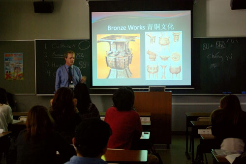 关西外国语大学的部分欧美留学生、在关西外大学习英语、法语、德语、西班牙语等语种的日本学生及部分中国在日的交换留学生等,参加了本次讲座。一个精通汉语和中国文化的美国老师,一群金发碧眼的西方同学,一些对中国懵然无知的日本同学,以及漂洋过海,在异国他乡求学的中国学生,他们共同谱就了一个和谐、美妙的乐章,用各自不同的眼睛、心灵和经验,从不同的角度感受中国文化的渊深,汉语世界的奇妙。