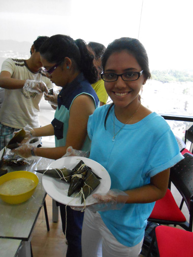 粽子下锅后,张剑萍和詹志群老师用图文并茂的ppt向同学们介绍中国端午节的起源、南北方的庆祝活动等等,介绍之中穿插的撞鸡蛋游戏则把此次活动又推向一个高潮。待到粽子出锅,大家小心翼翼地拨开粽叶,兴高采烈地品尝着自己的劳动成果。